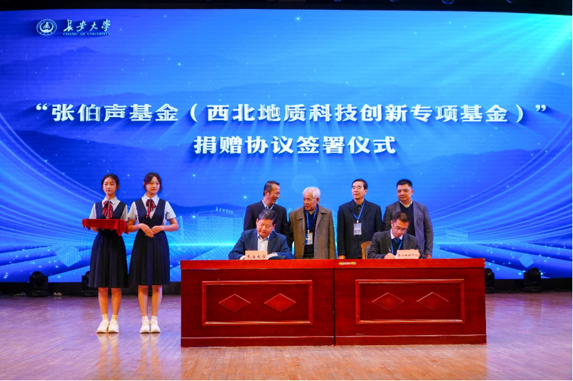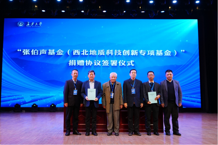 尹立河与长安大学副校长黎开谊共同签署了《张伯声基金(西北地质科技创新专项基金)捐赠协议》。张国伟院士、王双明院士、计文化、长安大学副校长李振洪上台见证。这一协议的签署,标志着各方合作进入了崭新的阶段,为传承科学精神、服务国家战略需求搭建了更为坚实的平台。