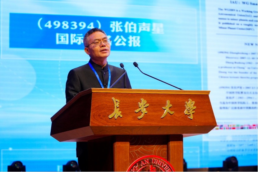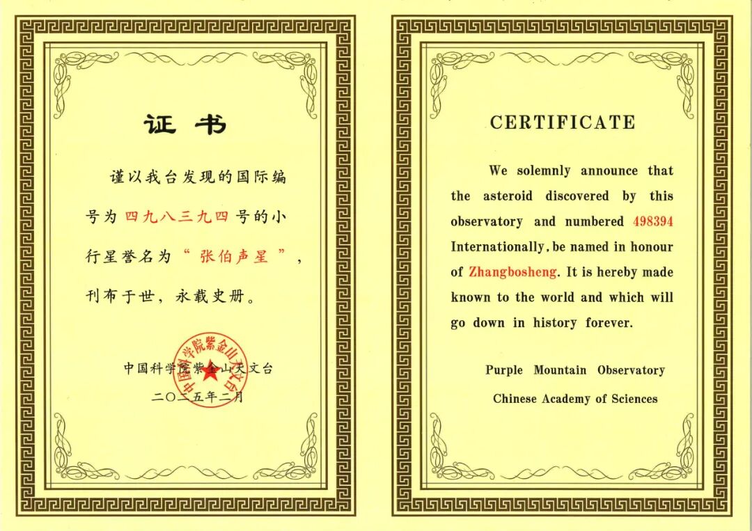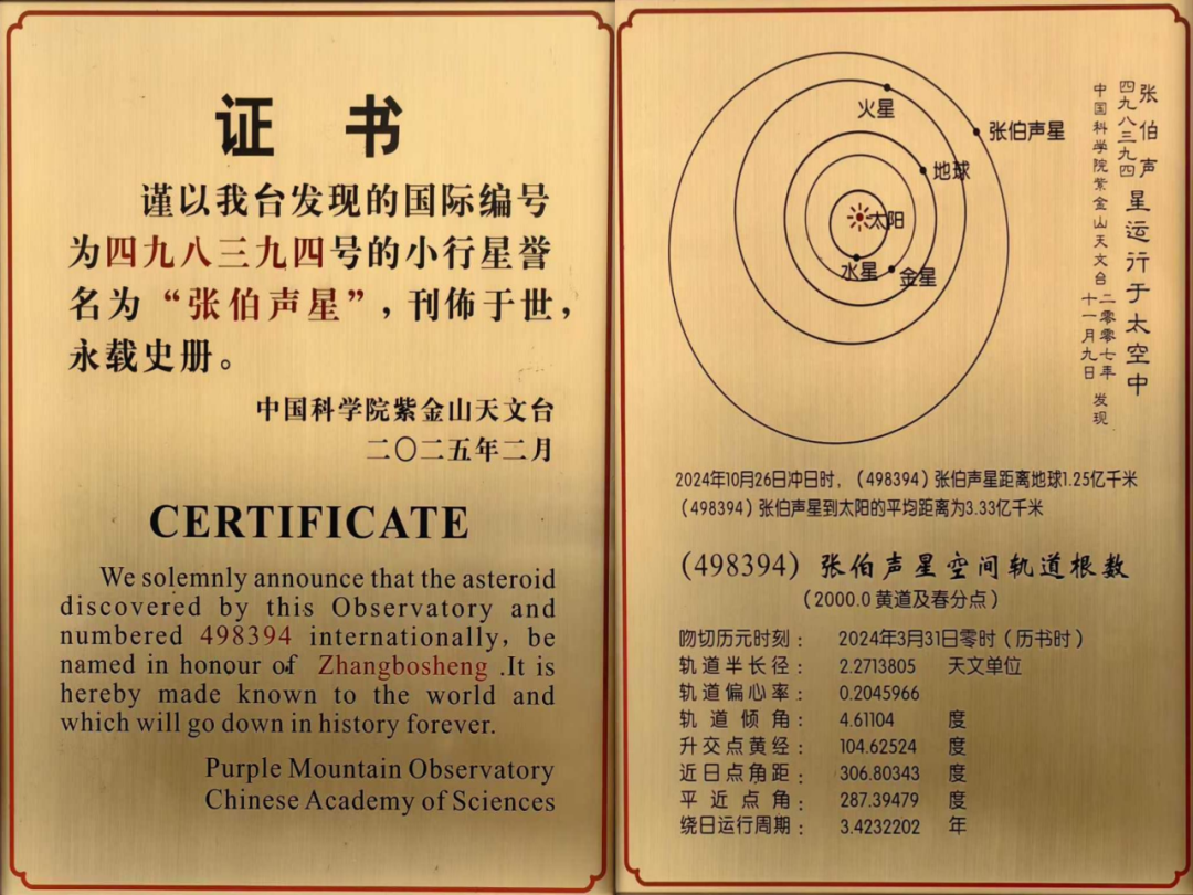 中国科学院紫金山天文台副台长范一中庄严宣读了国际天文学联合会关于“张伯声星”的命名公报和贺信:经国际天文学联合会批准,正式将国际编号为498394号的小行星命名为“张伯声星”。